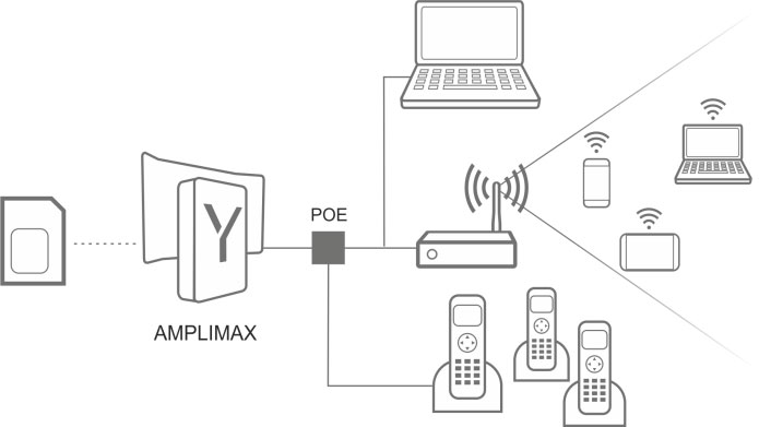 - El Amplimax ELSYS integra un módem 4G y una antena direccional heptabanda de alta ganancia con salida Ethernet y para teléfono fijo, compatible con tecnologías 4G, 3G y 2G.